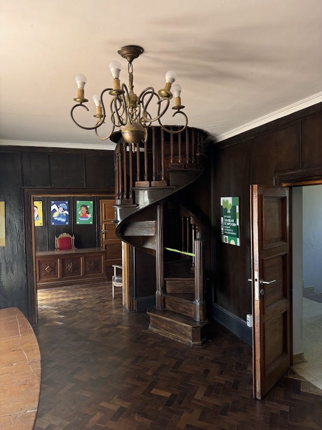 En el despacho estoy a solas. Abro y cierro puertas a más no poder. Allí está el escritorio que fuera de Bartolo y otros niños a lo largo de diferentes épocas. Una capa de polvo cubre todo. El balcón que recibió a Perón y Mercante estaba cerrado, lamentablemente. “No se puede salir al balcón”, fue la única advertencia que me había dado Pablo. Pero no había dicho nada de la puerta que se encontraba al lado de la silla ratona del primer mandatario, tapizada en una especie de escarlata. Las bisagras rechinan tanto que por dentro pienso“la cagué”. Pero desde abajo no llega queja alguna.