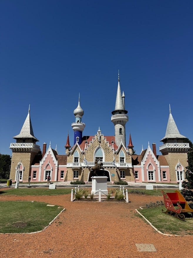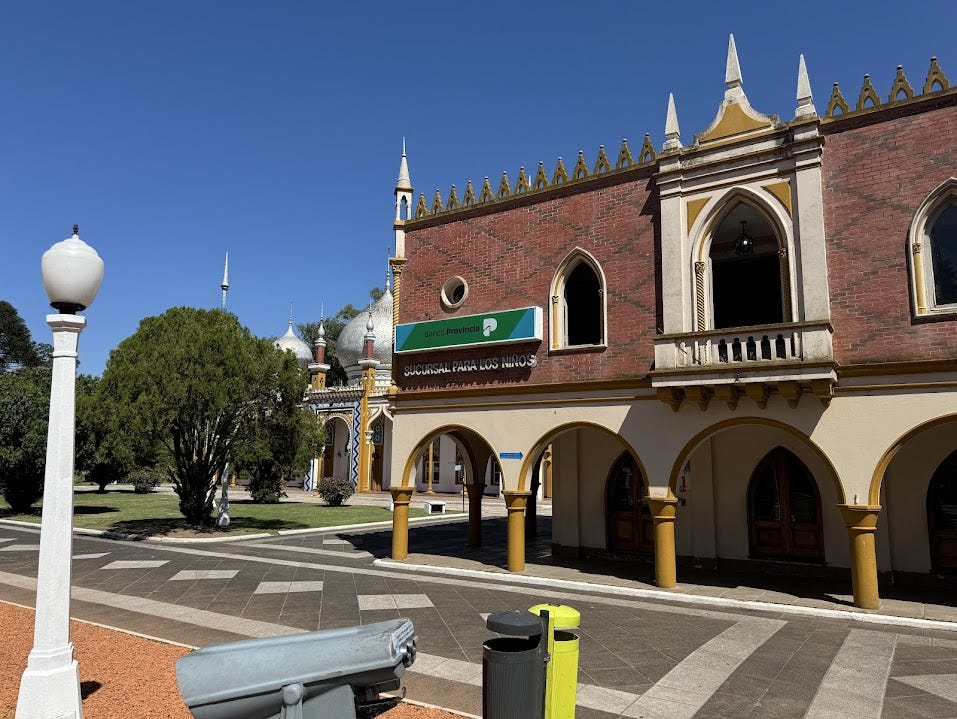Salgo de toda la sombra que puede dar la parroquia y voy a la plaza; la Plaza San Martín. El sol arreciaba en pleno verano austral. Quizás no elegí la mejor mañana para salir a caminar al aire libre, pero los colores se lucían como nunca. La plaza estaba rodeada de tonos pasteles y extravagantes ornamentos. A la izquierda, un castillo estilo medieval se erige con dos torres centrales en punta: la más baja me hace acordar a una iglesia ortodoxa rusa, la más alta parece lista para defender un feudo. El edificio combina el rosa, el azul, la piedra a la vista y las tejas mágicamente. Cruzando la plaza, un edificio sustentado por columnas amarillas en su galería te traslada a Venecia. Parece ser una réplica del mismísimo Palacio Ducal, pero sus puertas de madera terminadas en un arco ojival están hechas para venecianos de un metro y pocos centímetros más.