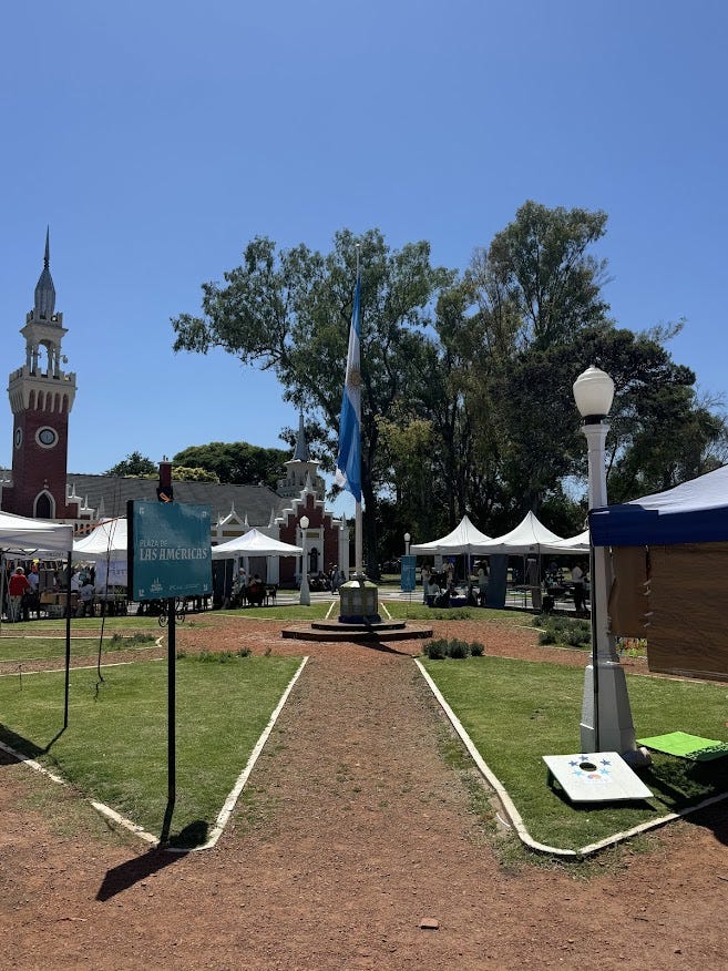 En amalgama con las casas medievales, me cruzo con un Mostaza—“our very own” McDonalds—, un puesto de churros con dulce de leche y, estoy seguro que más tarde, comenzará a oler a choripán en la avenida María Elena Walsh.
