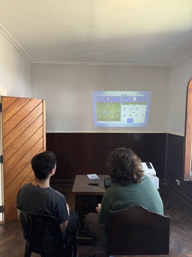 En el Palacio de Justicia nadie responde del otro lado de la puerta. Pruebo con el Palacio Legislativo, quizás tenga más suerte. Al fin y al cabo Milei convocó sesiones extraordinarias en Argentina. Quizás en la Repu siguieron su ejemplo. El lugar estaba abierto. Empezamos bien. Tomo el pasillo de la izquierda con la intención de visitar la Cámara de Diputados pero, antes de cruzar su puerta, una escena se gana mi atención y no me deja más opción que irrumpir en la puerta del otro lado del corredor. Dos niños de más de treinta años están sentados uno al lado del otro, mirando fijo a la pared frente a ellos. Uno ocupa una silla de plástico negra. El otro parece haberse robado una banca de Diputados para su reunión. Mi entrada no conmueve a ninguno. Ni una sola mirada de reojo. La proyección del FIFA 19 a pocos metros es más importante. Estudiantes vs. Boca Juniors.