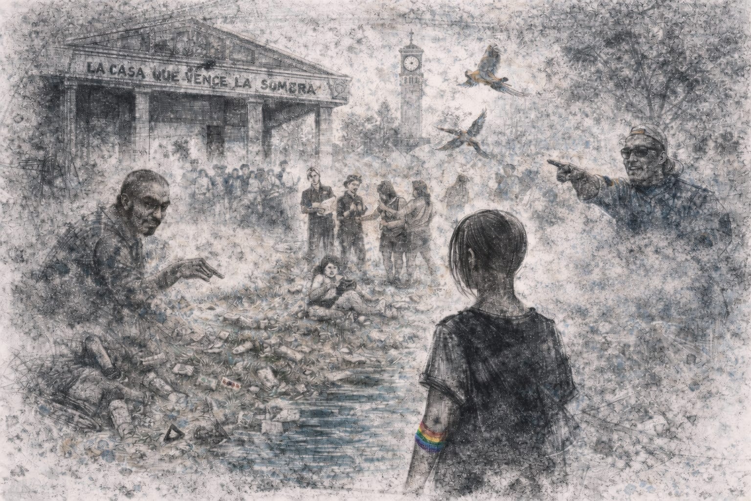 La casa que vence la sombra su entrada de nombres desaparecidos que se desplaza infinita hasta un reloj que campanea funebre las guacamayas gimiendo una tierra de nadie colillas de cigarro en la grama condones usados la maternidad alza el niño fecundado en el latex las guacamayas tienen crussing detrás de las canchas de tenis un muerto andante con los ojos cansados me ofrece mariguana mientras estoy sentada en el grafiti del patrimonio de la humanidad y una mirada austera en estas dañadas paredes hay mariguana condones cigarros ferias profesores abusadores pero no hay agua la casa que vence la sombra se enarbola con un slogan marketero y no se ve su sombra no se limpia su chiquero un loco con una camiseta del barcelona empuja a la gente se mete un paco travestido de estudiante y lanza una lacrimogena en humanidades un vigilante saborea con sus ojos mis piernas pero en mi cara sus ojos me lanzan piedras un bululú de carajitos liceistas una secta de evangelicos con guitarras un secuestrador con el guevo parao’ llevandose a las mujeres no falta el imbecil que se queja de la impuntualidad de un profesor que de clases por una locha y una cogida en control estudios la casa que besa la sombra una pulsera queer cabello rapao’ binder al pecho enfrente sandalias sifrinas falda y el pelo embojotao’ en un harapo la casa que besa la sombra me pone la mano en el hombro Y me dice “desaloja porque no puedes estar aquí”
