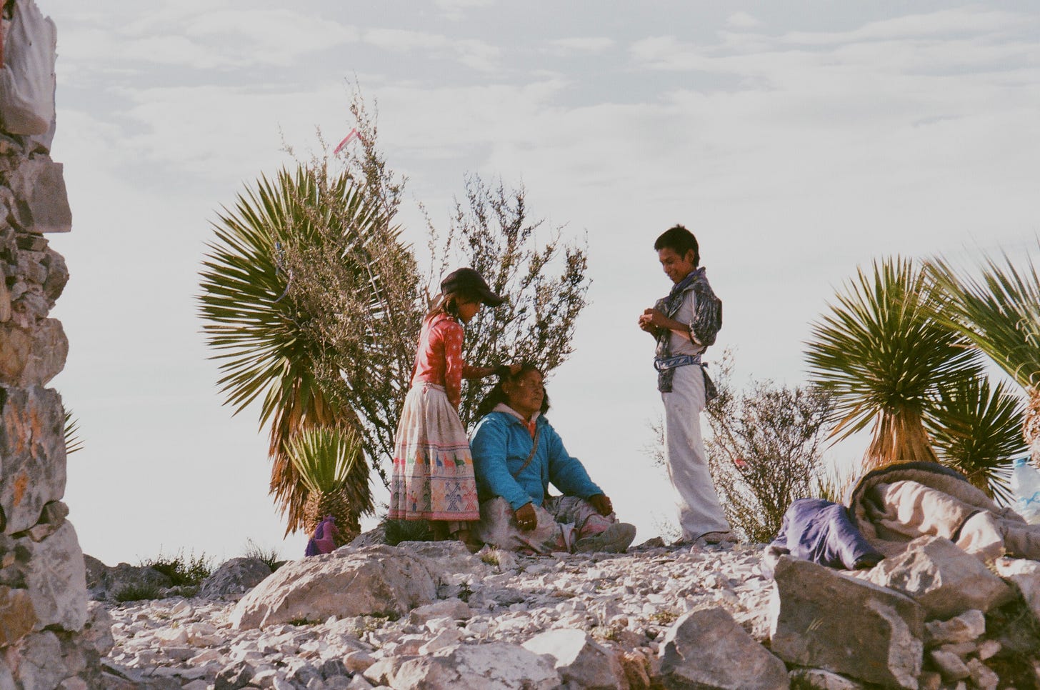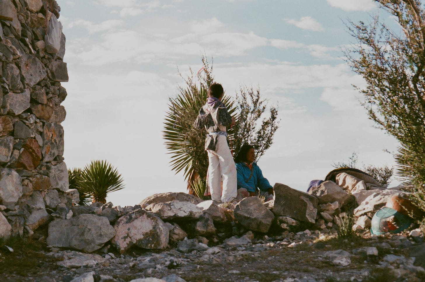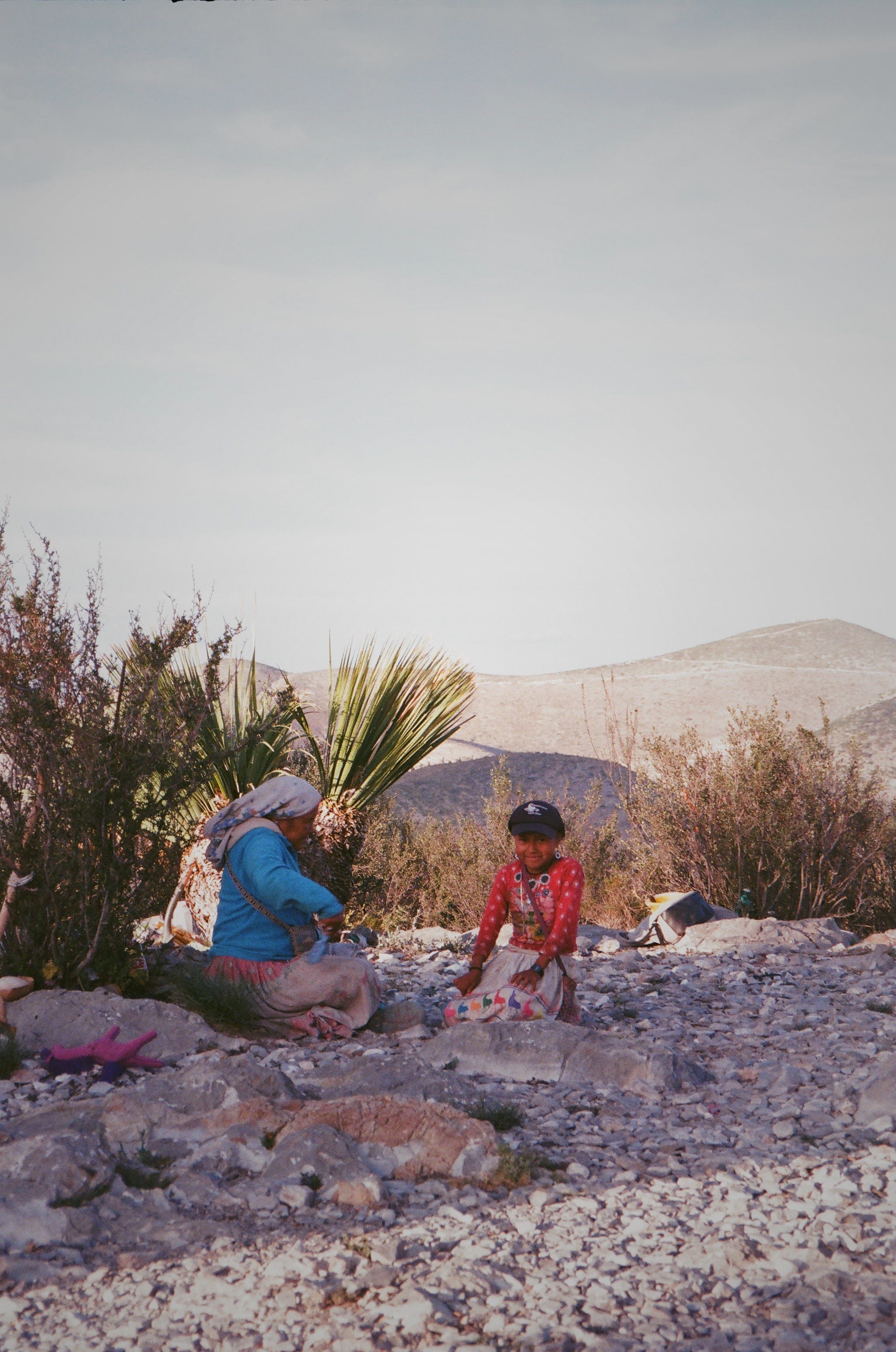 Otra coincidencia: mi interlocutora, al contarme la historia, defendió con el mismo fervor que me caracteriza la fotografía análoga,y me explicó por qué había optado por este formato específicamente para la ruta Wirikuta. Coincidimos en que la fotografía análoga es una imagen superior. Es la profundidad ontológica del mecanismo que captura un instante. En lugar de convertir la luz en una serie numérica, transforma un momento en reacción química. En las fotografías de Valentina, los colores del desierto de San Luis Potosí no se tocan ni se comprimen: conviven, cada uno en su profundidad; la intensidad del instante que vivió se palpa en lo impredecible y eterno del grano, en oposición al píxel y su perfecta forma y predictibilidad.