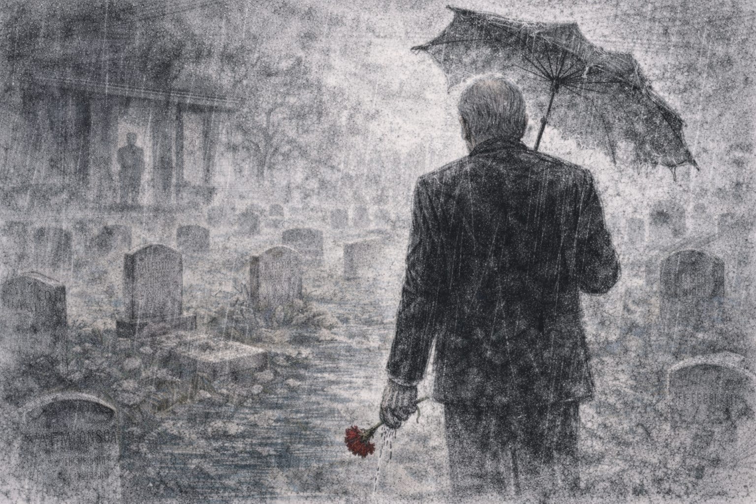 Alfonso está ya a medio camino cuando, para su sorpresa, comienza a llover. Echa mano de su sombrilla, pero al abrirla se da cuenta de que está rota. Decide seguir andando bajo la lluvia y lo cierto es que nadie se extraña al verlo atravesar las inundadas calles, con su traje negro empapado y su clavel aplastado por las gruesas gotas. Ni siquiera el portero del cementerio se sorprende al verlo acercarse y entrar por la puerta abierta de par en par, sin cruzar saludo ni palabra. Es Alfonso el que se queda perplejo cuando, luego de recorrer el camino de siempre y llegar al mismo lugar, no encuentra allí la anhelada tumba de su esposa.