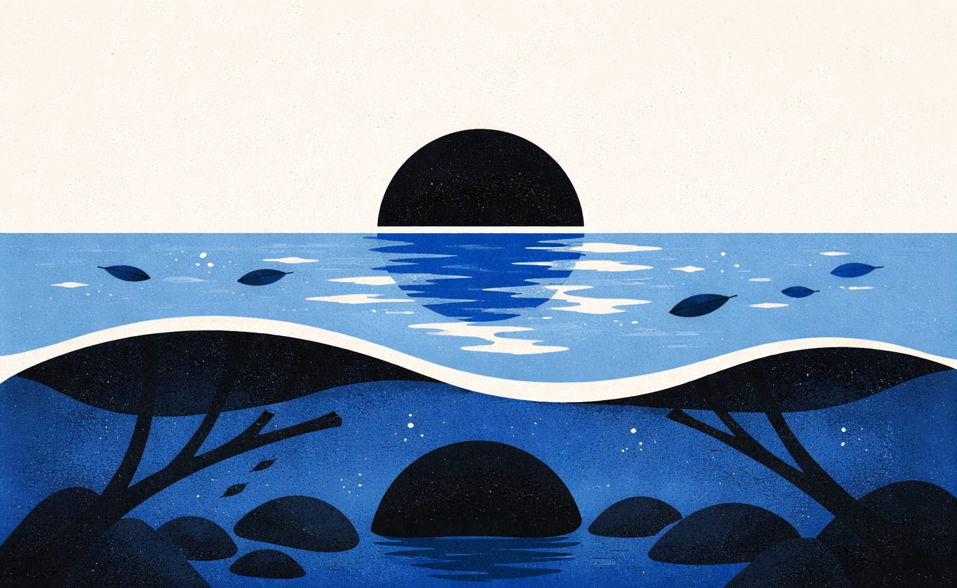 Allá, Los rayos de luz filtrados sobre El ondeante lecho de barro. Allá, Rocas pulidas convertidas en huevos ancestrales Por los embates del tiempo. Allá, Naufragios de troncos milenarios Como dedos de titanes vencidos. Acá, Bosques invertidos que presagian Mundos más allá del mundo. Acá, Flotas de hojas navegantes siguiendo Corrientes invisibles. Acá, Los destellos solares y las nubes de agua Sobre la superficie del agua. Mis ojos, Allá y acá, ¿Pueden ver el reflejo y el fondo del río al mismo tiempo?