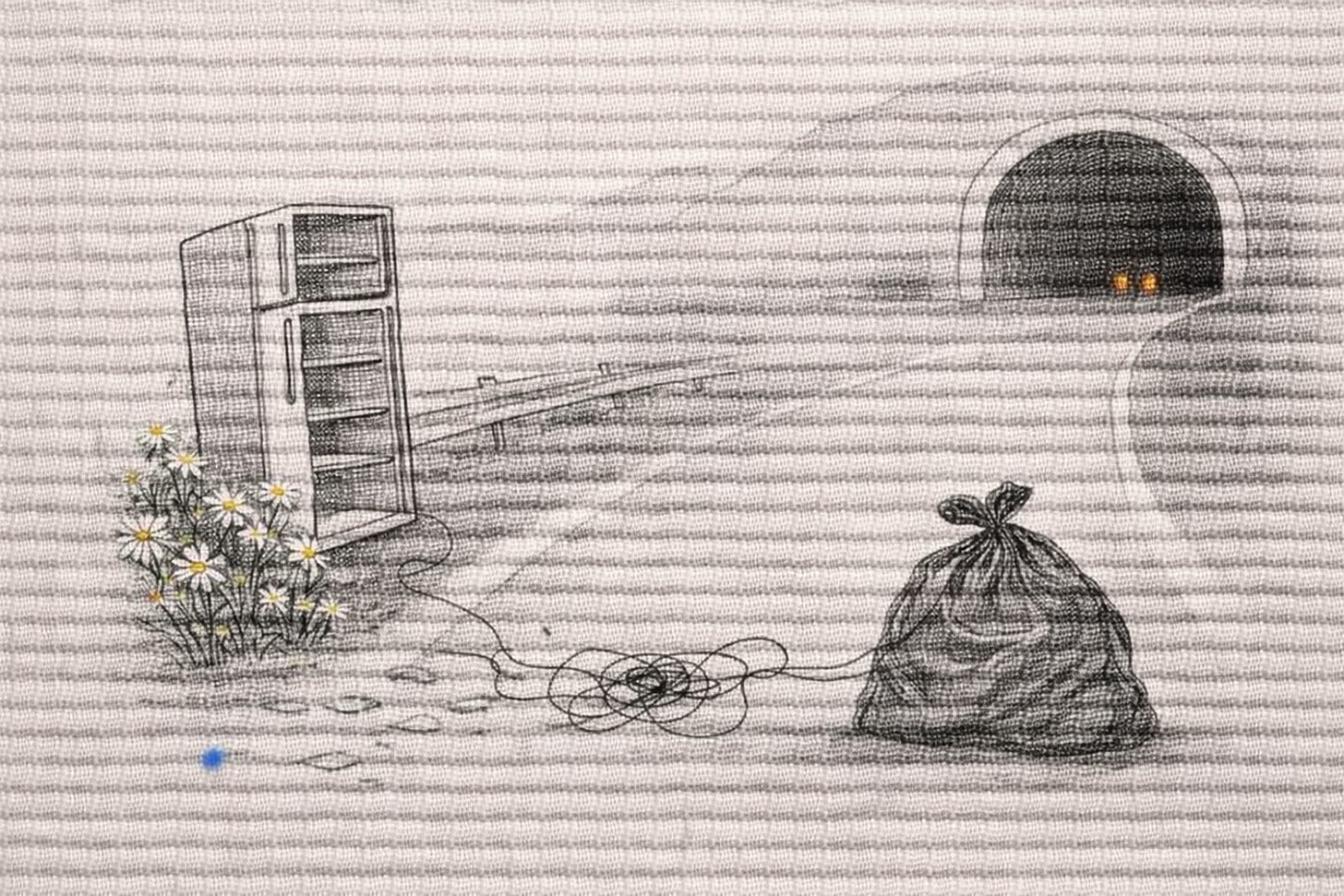 En el margen lateral de una carretera, un refrigerador, vuelto hacia el vacío. A unos metros, un camión de Kroger, “fresh food for everyone”, sobre la grava. Las margaritas brotan del concreto, sus tallos tiemblan con olor a diésel. Los vidrios rotos brillan como peces, el aire sabe a fruta fermentada. Regresando del Ocotal, el túnel, pesada, una bolsa de plástico moviéndose una fuerza la empuja desde adentro. Los coches la esquivan, nadie la toca, el eco la mantiene en su silencio. Las montañas respiran luz cansada, la curva se traga lo que se alcanza a ver. El túnel guarda intacta su oscuridad.