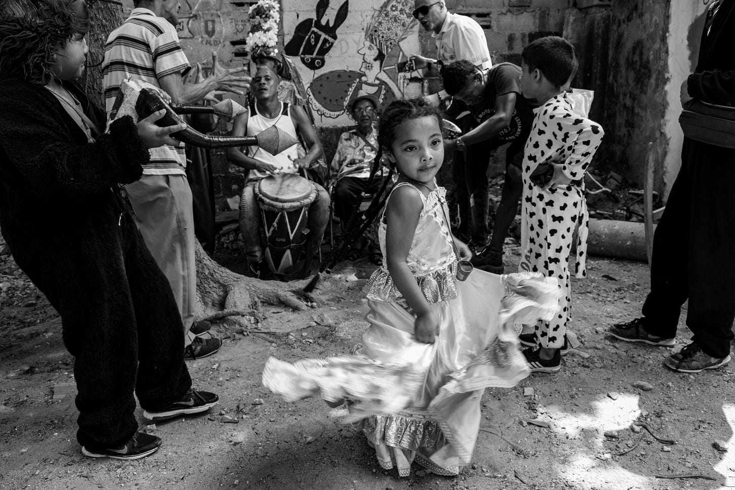Y al recordarme esto, las fotografías de pronto parecen convertirse en cine. La actividad en ellas parece tan real, el movimiento congelado parece querer descongelarse y en más de un par de ellas tengo que comprobar que no estoy escuchando un vallenato o una salsa. Tienen un nivel de composición, de lirismo, de poética, que parece producto de una escena simulada.