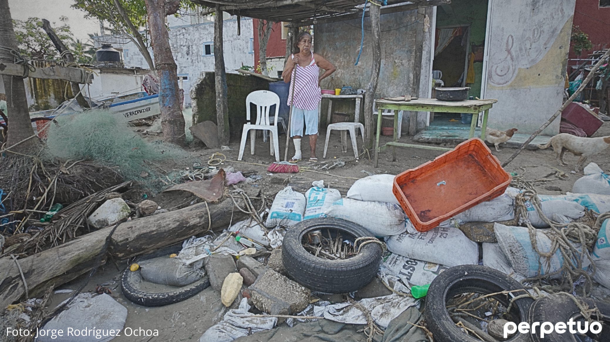 El resto de las y los vecinos también contaban con “protecciones” semejantes. Una de ellas, es Victoria Reyes Rosas, una mujer de avanzada edad que vive sola. La encontré sentada frente a su entrada, mirando el océano. Tenía una pierna vendada. La otra, descubierta, también tenía lesiones, signo de diabetes avanzada sin un tratamiento adecuado. El miedo a la marea ha afectado sus noches de sueño. Al temor, se suma la desesperanza, ante los gritos y gritos que son ignorados por quienes ostentan el poder.