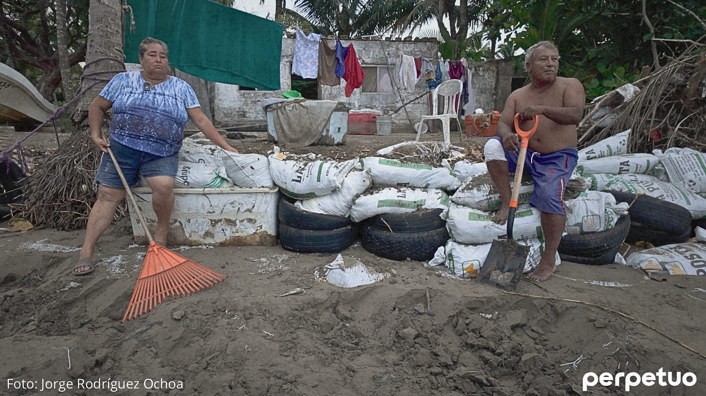 Cuando empieza a oscurecer, las y los habitantes de Las Barrancas arrancan el diario protocolo preventivo. Me encontré a Dora Sosa, y a su esposo, Alejandro Cabañas afuera de su casa cavando una pequeña zanja que poco ayudaría en caso de una tormenta que alborotara peligrosamente el oleaje. Al frente de su casa colocaron una barrera conformada por una decena de costales con arena y siete llantas de coche.