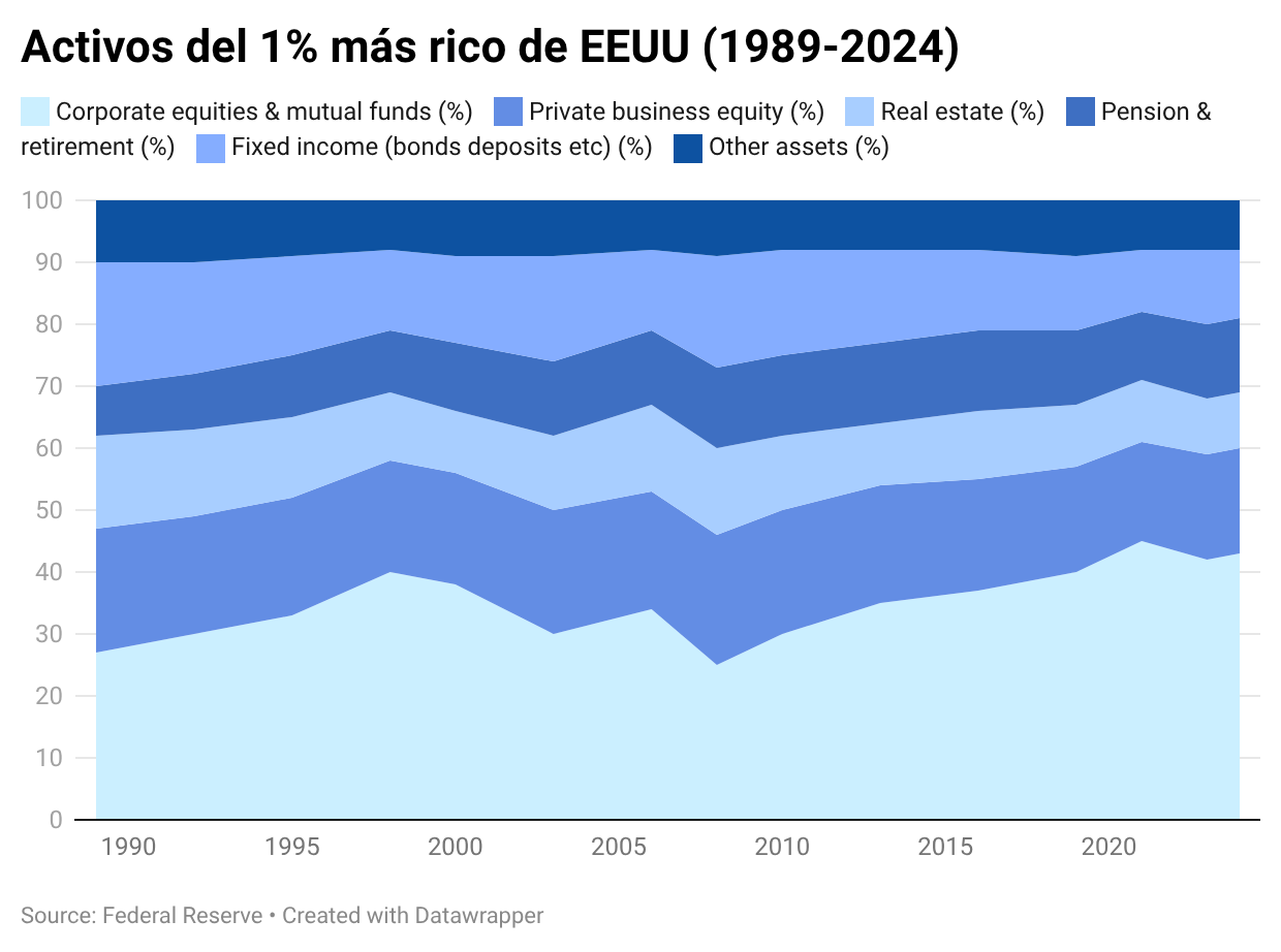 Los burgueses también han cambiado. Si antes, su riqueza venía de controlar los medios de producción de la fábrica (de tener un monopolio de la fábrica), ahora viene de poseer las acciones de una empresa. Ahí hay una alienación interesante y filosófica; el burgués es dueño de muchos fragmentos de muchas fábricas pero, rara vez, de una sola. Lo mismo es cierto si pensamos en el colectivo. La empresa ya no es propiedad de uno solo; ahora es de unos muchos. La data no va tan atrás pero, al menos en los Estados Unidos, desde el 89, el porcentaje de la riqueza del 1% más acaudalado pasó del 27% al 43%. Ahí ya hay algo a explorar, también. Sobre cómo los medios de producción ya no son de nadie. Se ha vuelto en algo más amorfo; más difícil de atribuir culpas.