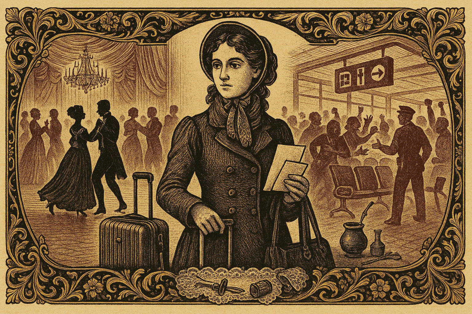 Mi marido intentó consolarme recordándome que los trayectos complicados abundan en las novelas de Jane Austen: «A la hermana grande linda la agarra un diluvio cuando va a caballo a lo de los ricos, se enferma y casi se muere, pero después todo termina bien», me dijo. Acabábamos de ver juntos la producción de Orgullo y prejuicio de un grupo shakesperiano que se había desviado de su repertorio isabelino para homenajearla, así que él tenía al argumento bien presente. Pero yo estaba muy triste. Mis padres encima me habían encontrado en San Telmo un encaje exquisito apenas decolorado que era ideal para poner un ribete sobre mi vestido de poliéster y darle una pátina de autenticidad/respetabilidad. Tendría que esperar.