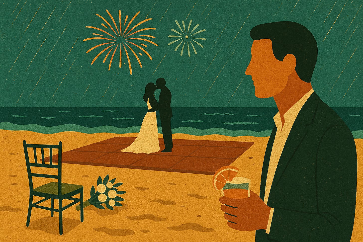 El novio le dio una vuelta a su mujer, dejándola caer en sus brazos. La besó apasionadamente. Fuegos artificiales estallaron detrás de ellos e iluminaron el entarimado que yacía sobre la arena, a pocos metros de la orilla del mar caribe. Las amigas de la novia gritaron como si la selección hubiese metido gol; las señoras menopáusicas se secaron las lágrimas y aplaudieron.